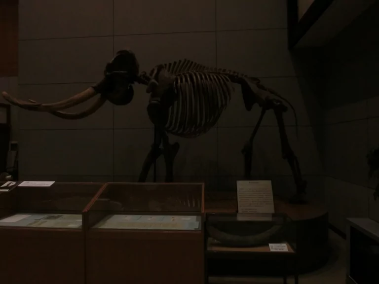 写真が暗くて見づらいですが、ナウマンゾウの全身骨格レプリカのようです。右下の牙だけは本物のようでした。